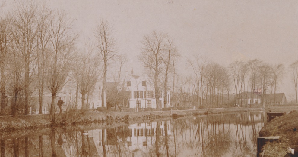 aan de overzijde v.l.n.r. een boerderij, dan twee huizen met puntdaken aan elkaar verbonden door een lager bouwdeel en dan een wit pand, ook met 2 nokken, voorzien van luiken