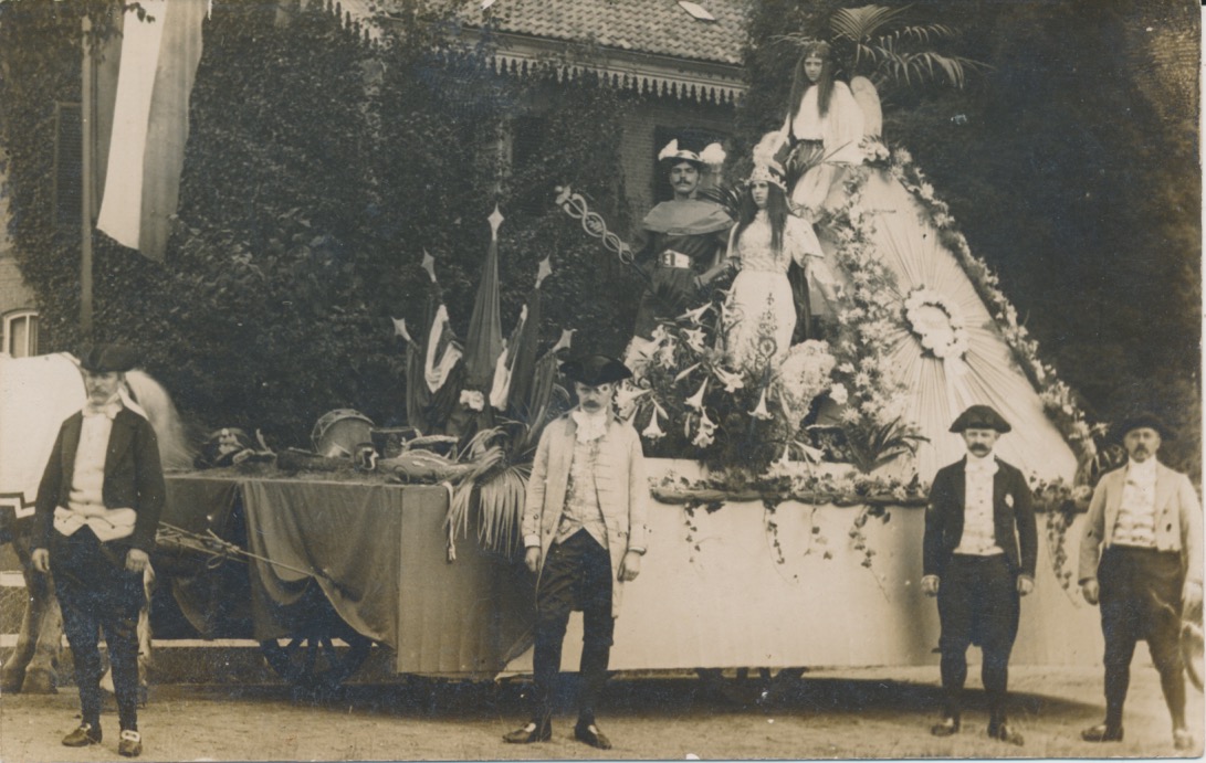 6936 wagen in optocht, man met Mercuriusstaf