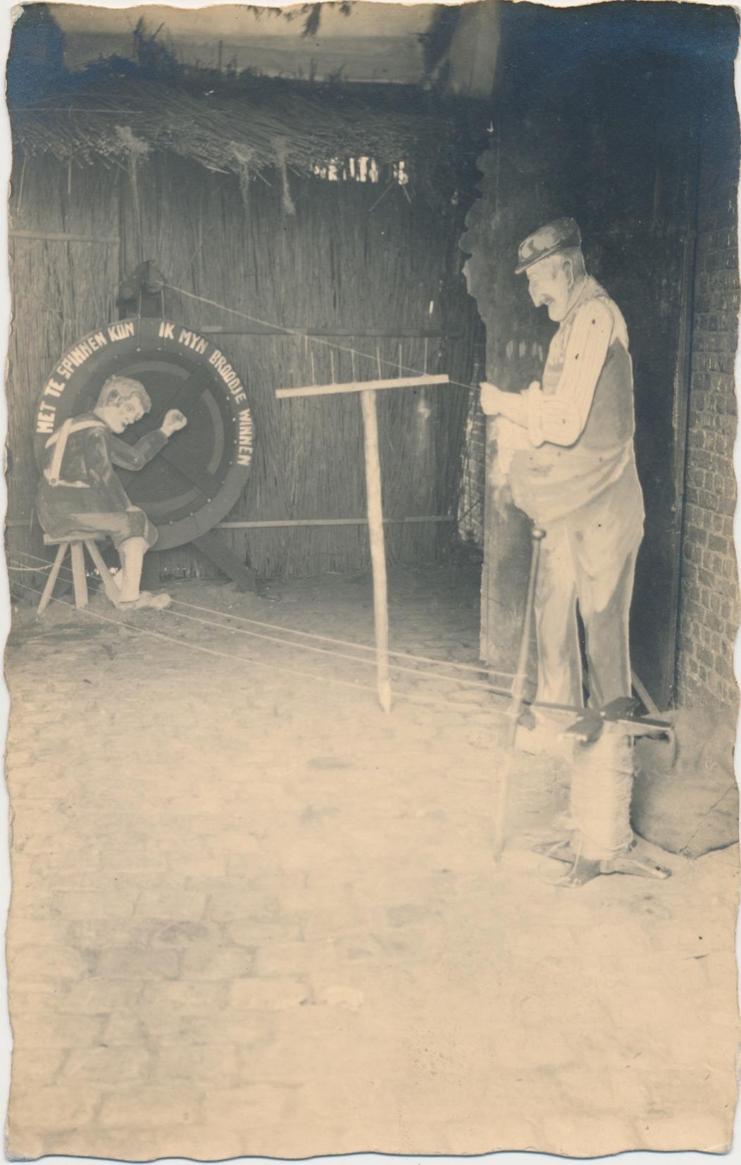 De man rechts heeft de (hopelijk) gekaarde wol in de hand en 'voert' die aan de draaier van het wiel. Buiten beeld wordt de gesponnen draad opgevangen. In het beeld staat een kale 'hark'; op de pinnen moeten de draden worden opgewonden. Aan de pook in de voorgrond zitten drie draden vast die buiten beeld lopen. Iets soortgelijks zie je op deze link: http://www.delcampe.net/page/item/id,33 ... age,D.html.