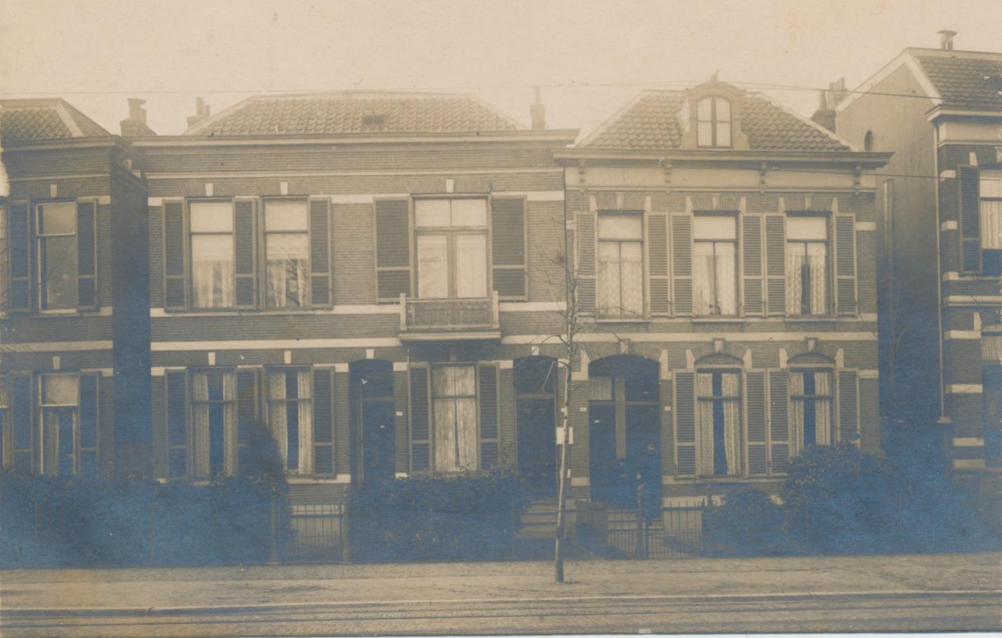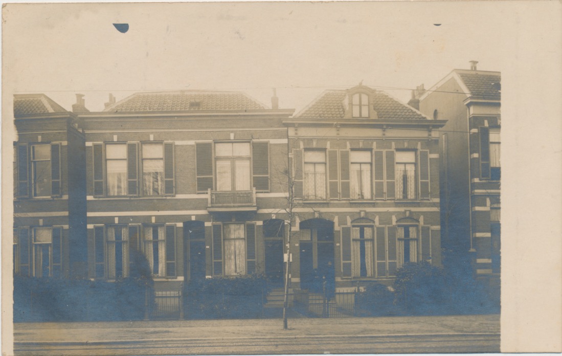 Dit kan Arnhem zijn. Dubbelspoor elektrische tram. Smalspoor, omdat de sporen wijder uit elkaar liggen dan de spoorbreedte. Kleine witte huisnummerbordjes. Oneven nummers aan linkerzijde. Bovenwoningen met eigen huisnummers (zonder toevoeging). Arnhemse louvreluiken. Treden voor de voordeuren.