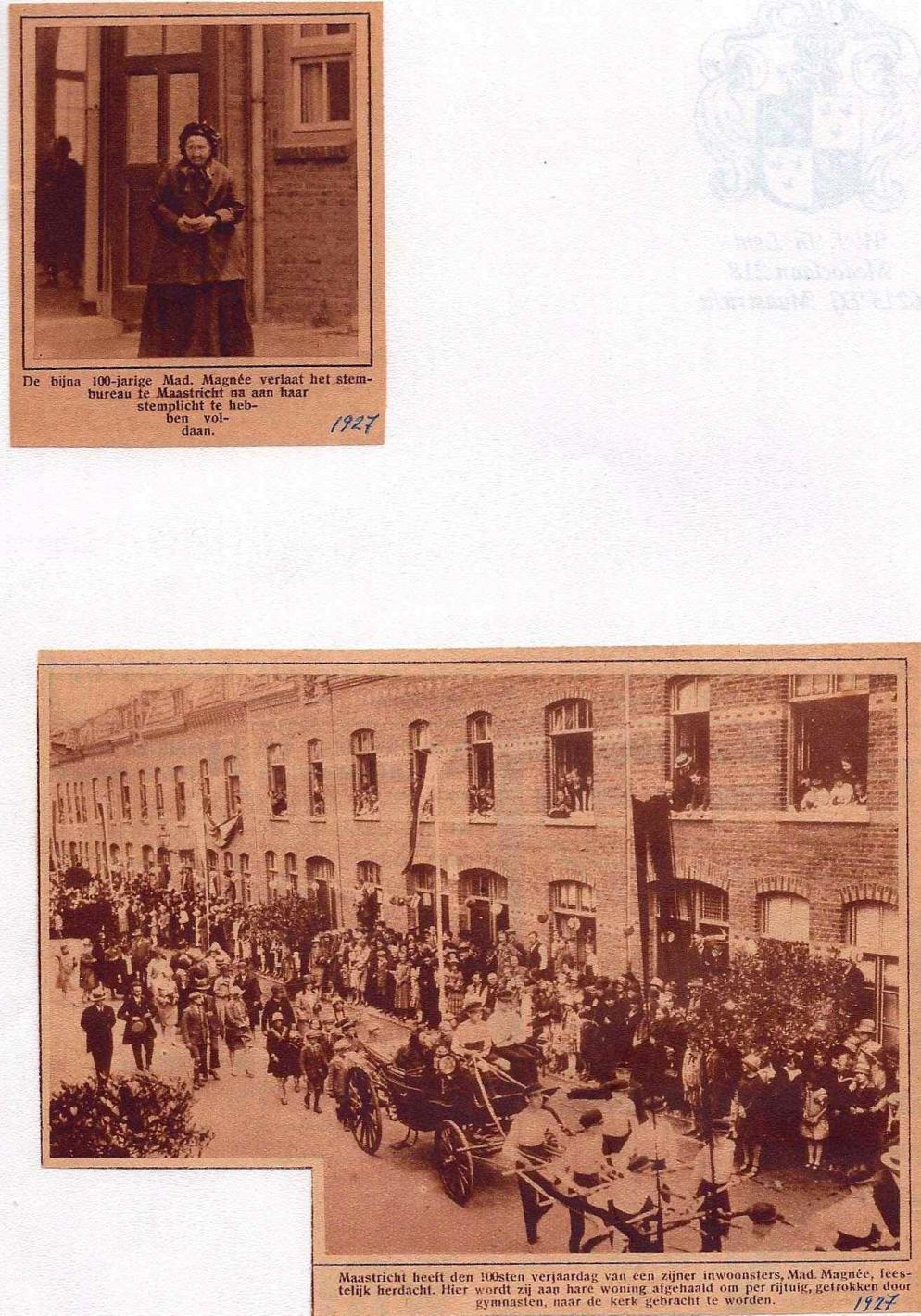 Het antwoord dat dit inderdaad Maastricht is, kwam overigens van Wil Lem, een plaatselijke autoriteit. Hij herkende een foto, die Berry mij recent stuurde, van een krantenfoto uit de tijd zelve. Het bijschrift luidde dat mevrouw Magnée hier aan haar woning werd afgehaald om met een rijtuig getrokken door gymnasten voor een dankmis naar haar parochiekerk te worden gebracht. Het stembureau waar sprake van is, lag aan de Elisabeth Strouvenlaan, in de buurt, maar toch nog een hele wandeling voor een honderdjarige.