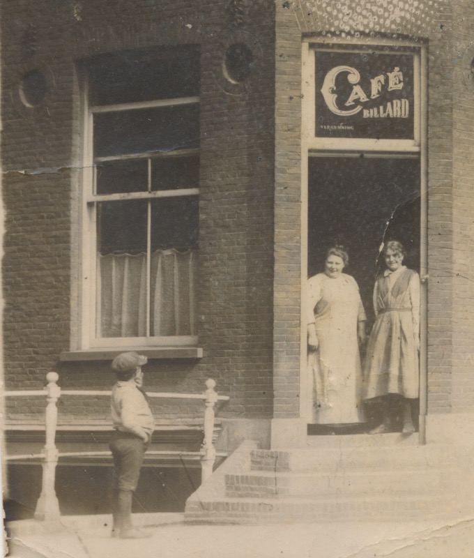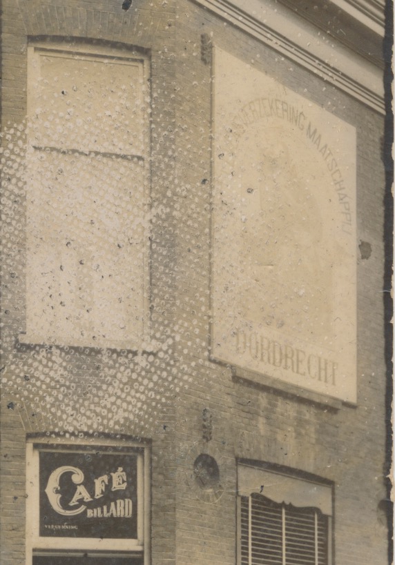rechtsboven aan de gevel een welbekende reclame van de Levensverzekeringsmaatschappij Dordrecht