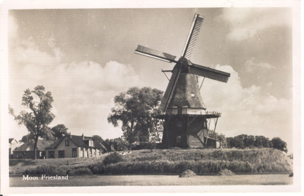 Een echte foto van een fraaie stellingmolen met een aantal woninkjes in de serie "Mooi Friesland", verder niets bekend.