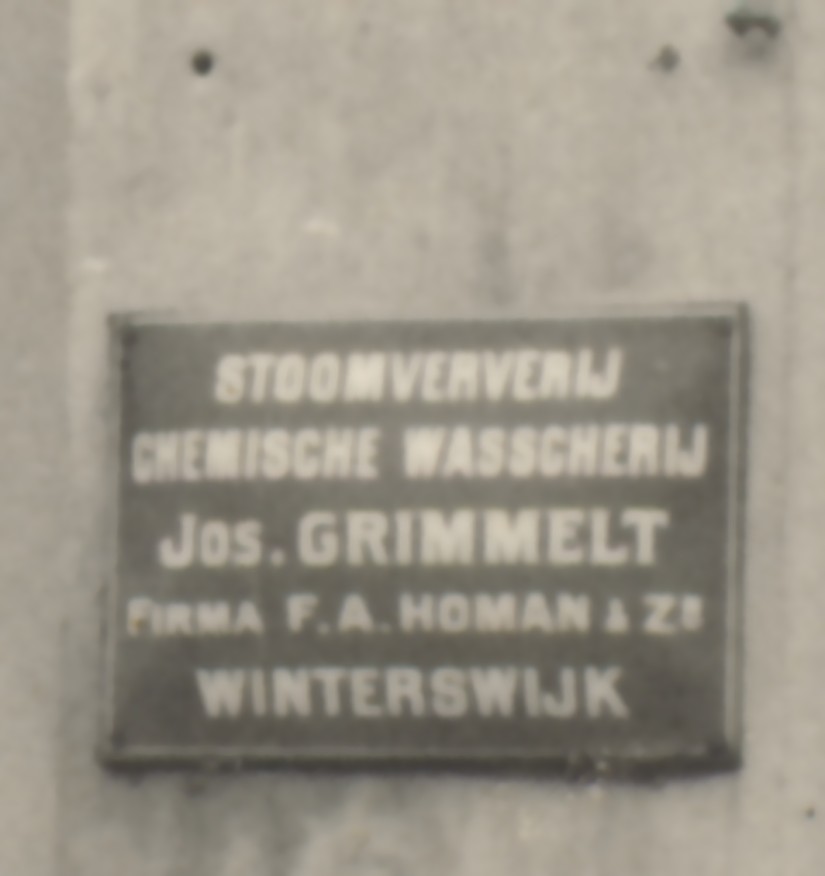 aan de gevel een bordje van Jos Grimmelt, stomerij en wasserij, in Winterswijk, firma F.A. Homan & Zn., ik zal van dit bordje hieronder nog een scan plaatsen