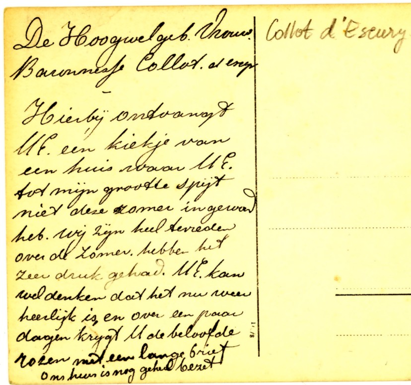 wel beschreven en gericht aan een vaste gast, die dat jaar niet had geboekt, nl. de hoogwelgeboren vrouw Baronnesse Collot . d escep (laatste stukje slecht leesbaar)