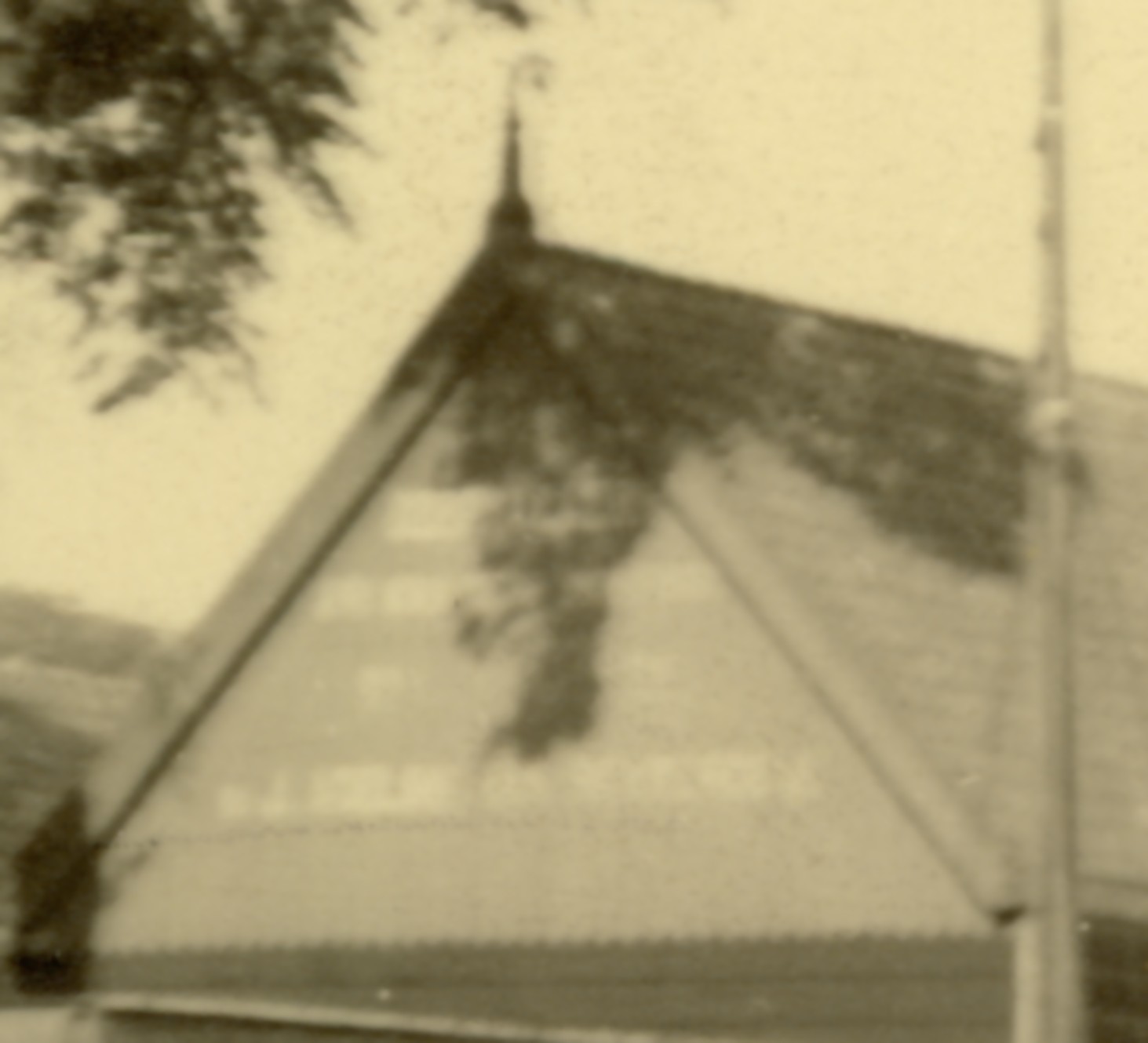 op de kop van het gebouw onder het dak staat in witte letters de naam van het bedrijf, jammergenoeg niet te lezen