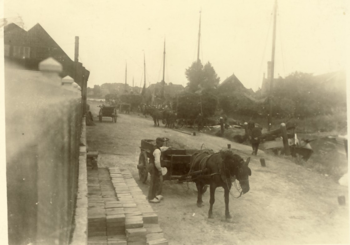 op de iets daarcahter staande paard(en)-en-wagen wordt vanuit en door een schip aangevoerd hooi of iets dergelijks hoog opgestoken