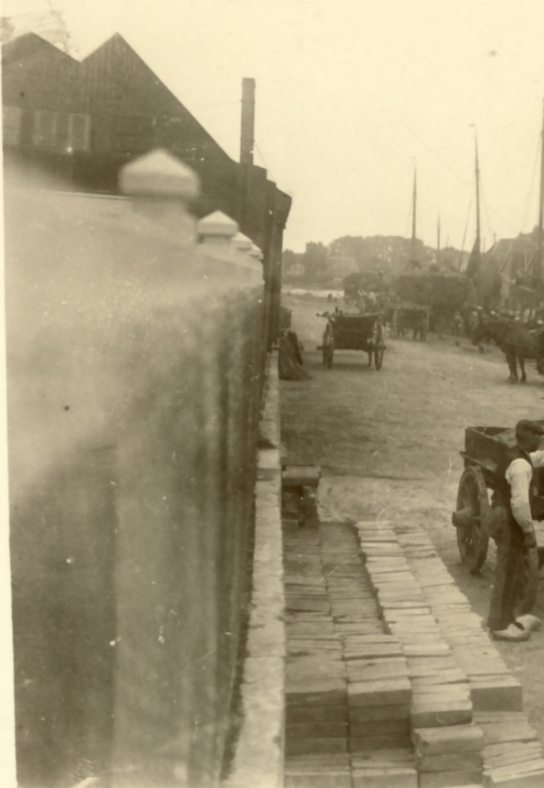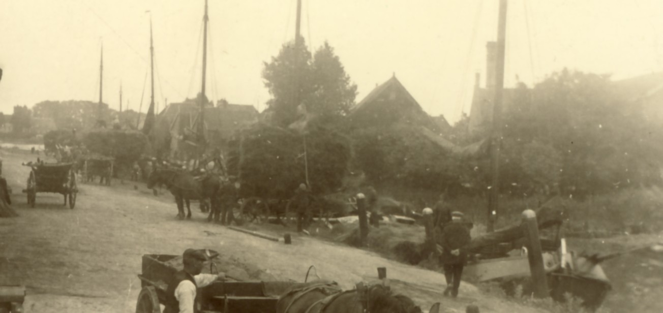 Volgens mij is er op de wagens geen hooi opgetast, maar riet, biezen of wilgetenen. Zoals eerder betoogd, zien we een getijdehaven. Riet, biezen en griendhout kwamen hoofdzakelijk uit de Biesbosch, een getijdegebied. De exploitanten, hoepmakers en mandenvlechters zaten in Sliedrecht, Giessendam, Hardinxveld, Werkendam, Lage Zwaluwe, Drimmelen en Raamsdonksveer. Van deze plaatsen is de haven van Raamsdonksveer de enige die redelijk overeenkomt met het zoekplaatje. De buurtschap Sandoel (Raamsdonksveer) bestond grotendeels uit deze arme werkers. Ik heb de indruk dat de producten op het zoekplaatje per schip worden áángevoerd, dus op de wagens geladen.