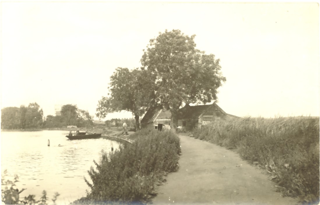 Dit is de Amstel bij de Omval met zuidergasfabriek en de watertoren aan de Spaklerweg op de achtergrond. De foto is gemaakt aan de Ouderkerkerdijk.