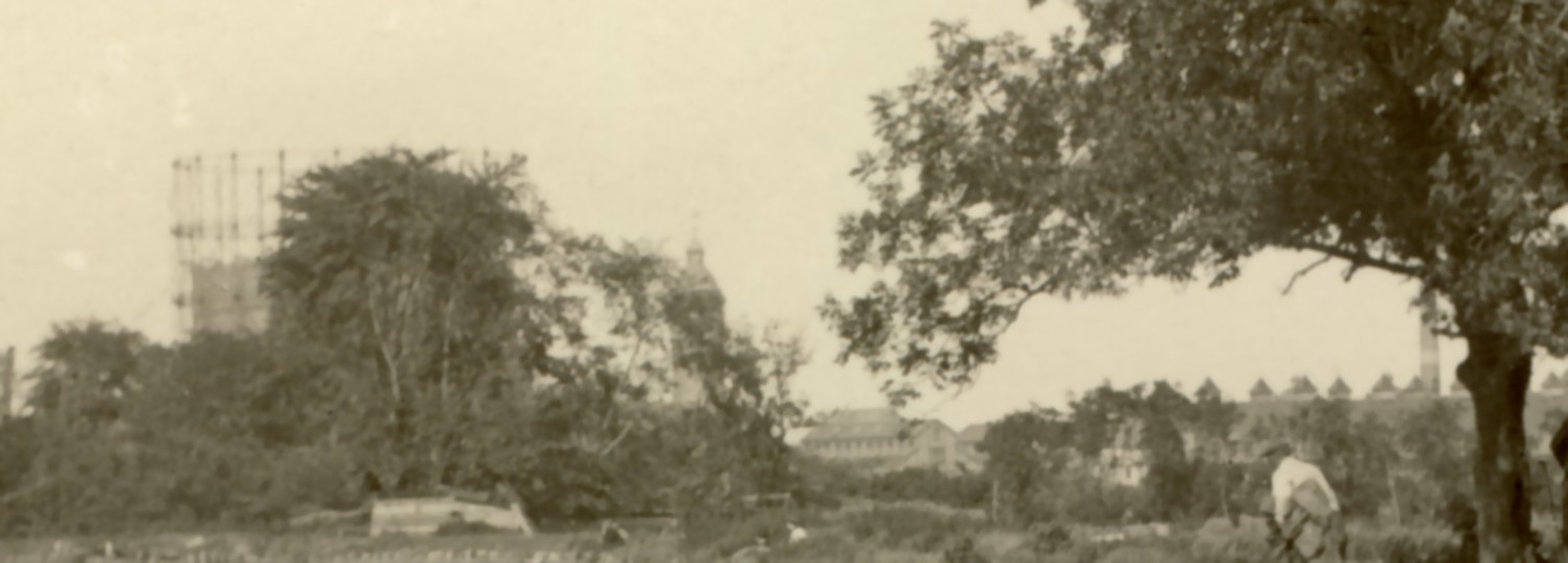 rechts van de gasfabriek een toren, dan naar rechts een groot gebouw (fabriek schat ik) en dan weer naar rechts een gebouw met puntkoepltjes op het dak met een toren