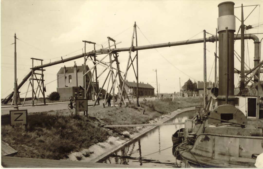 Interessante foto en afgezien van de vraag waar, gaat het mij meer om de vraag wat. Ik zie een schip met buisleiding aan de wal die geen kade is, want daarvoor ontbreken aanlegpunten en loopt de kant te schuin. Dat schip lijkt verbonden met de buisleiding een wat gaat daar doorheen. Dat schip lijkt mij een twinboiler, omdat de schoorsteen niet in het midden staat, dus staat er aan de andere kant nog een. Dit type komt wel voor in Amerika en is mij in Nederland onbekend. Die gebouwen lijken mij geen woonhuizen, dit type gebouw komt voor bij gasfabrieken, maar ik zie geen gashouders. Dus al met al geeft deze foto een boel vragen. Dan is er nog die paal, die lijkt op een mast van de bovenleiding van de tram, maar nergens ie ik rijdraden of een spoor, dus neem ik aan dat het een deel is van de totale constructie.