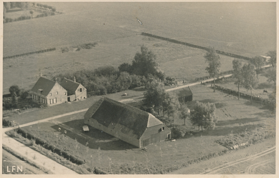 2989 luchtopname LFN van woonhuis en schuur, ernaast rietgedekte grote stal, weg GDKO