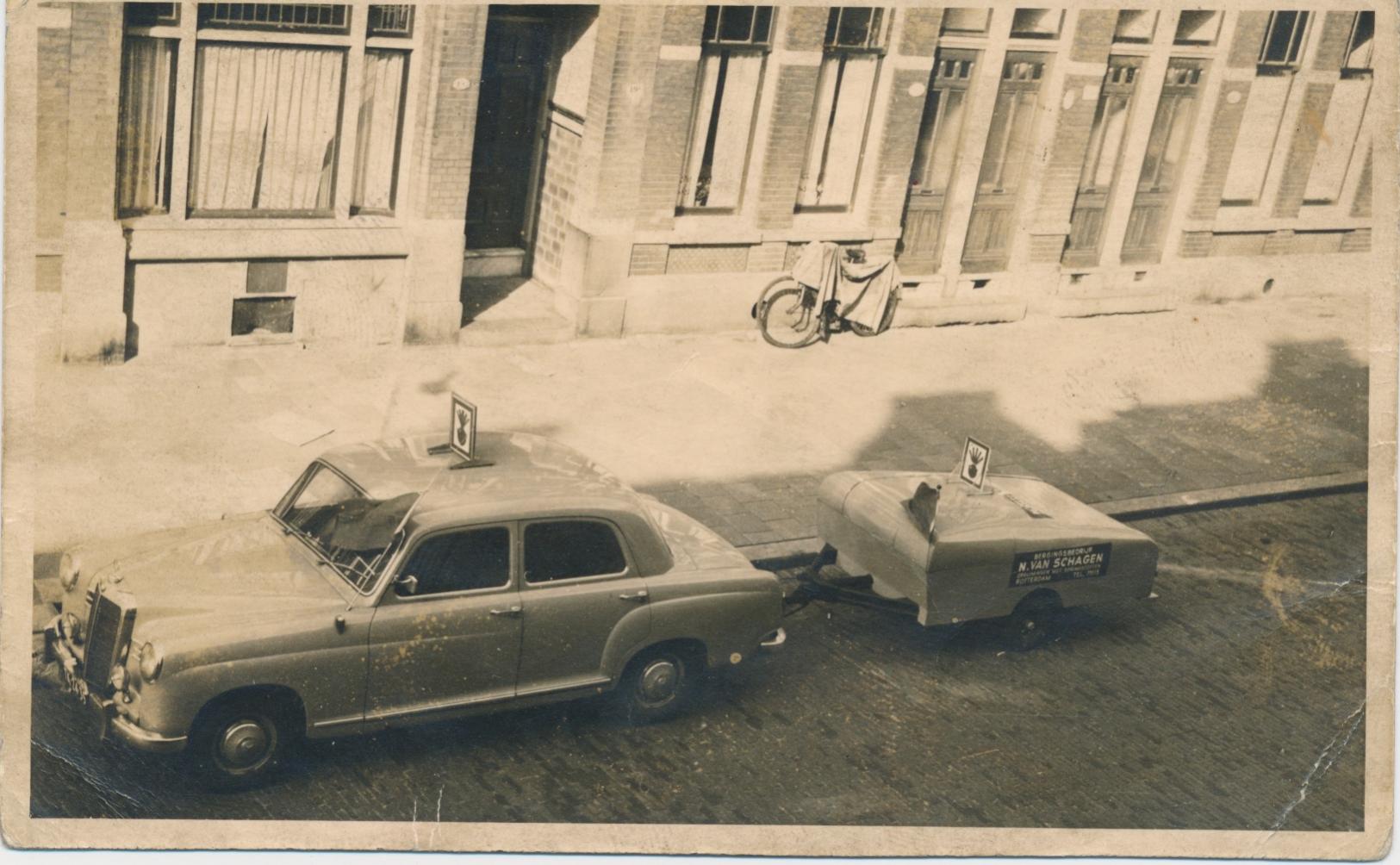 Mercedes met aanhangwagen van Bergingsbedrijf N. van Schagen, Opruiming met Springstoffen, Rotterdam, telefoon 75115
