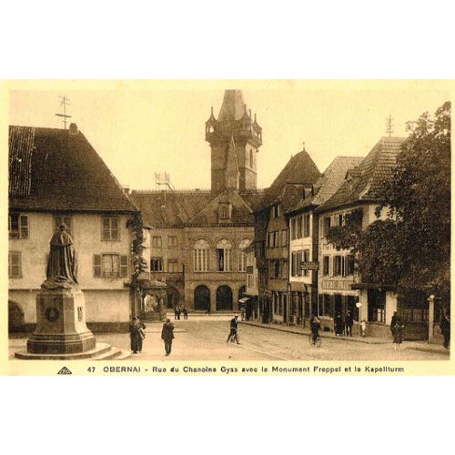 Dit is in Obernai, in de Elzas (Fr). De Rue de Chamoine Gyss met het standbeeld in van Mgr. Freppel (wie kent hem niet).