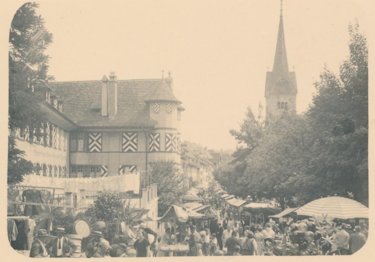 3324 gebouw met opvallend gekleurde luiken, markt en kerktoren op achtergrond