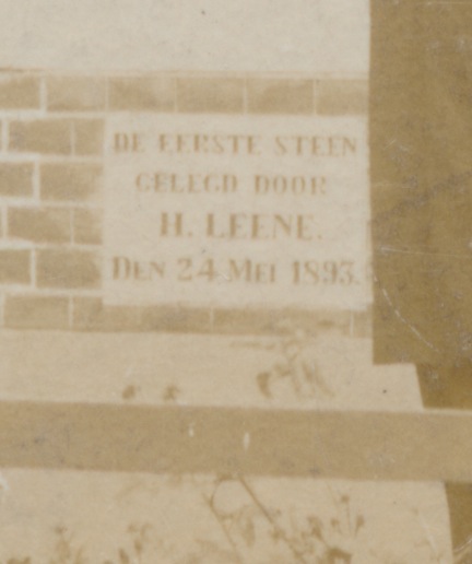 op gevelsteen: de eerste steen gelegd door H. Leene den 24 mei 1893