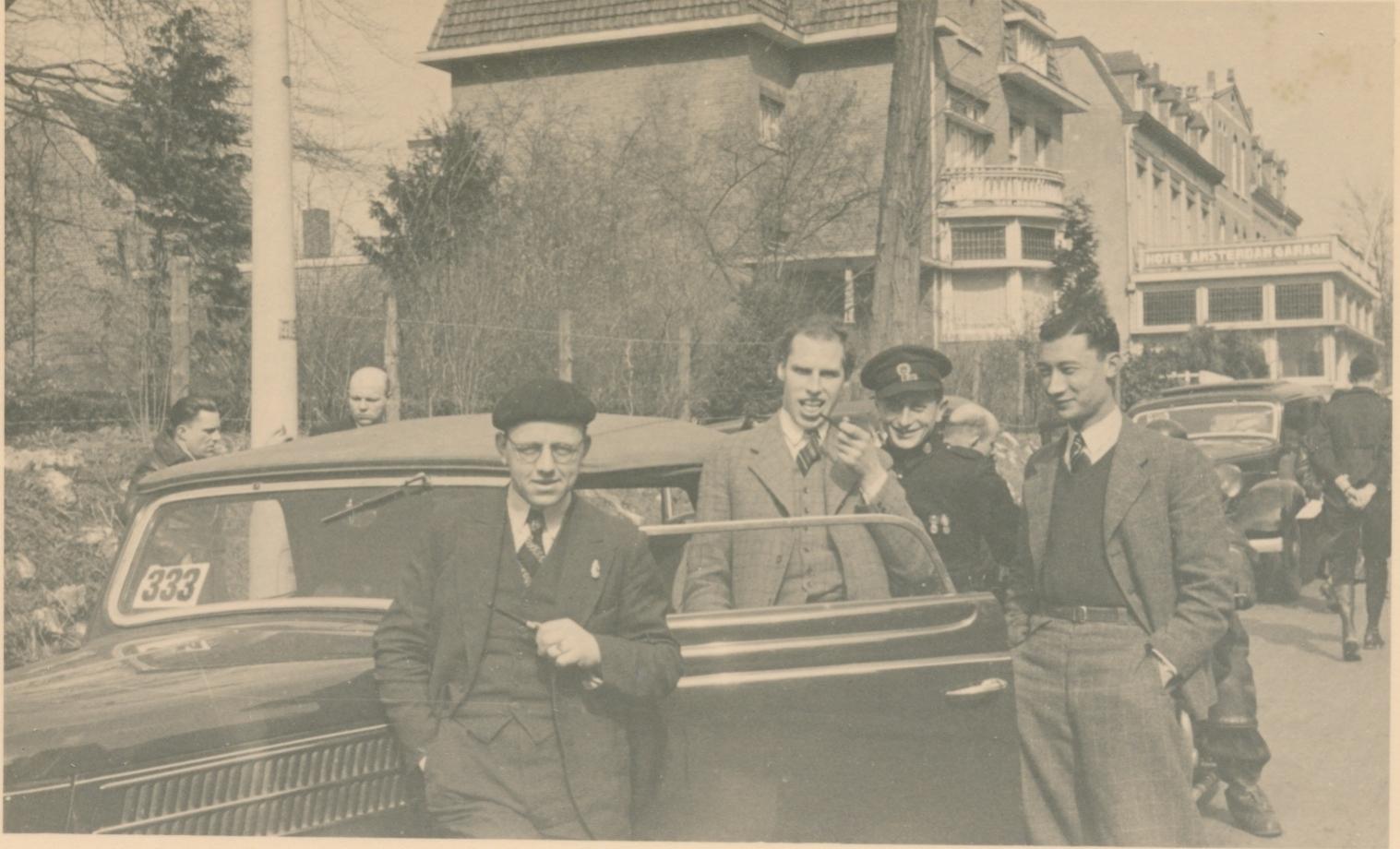 Een aantal van de heren op deze foto herken ik. De 'Indische' man met de handen in de zakken is volgens mij niemand minder dan de bekende rallyrijder Maus Gatsonides. De man in het midden met mond open is Carol Schade, denk ik. Hij was ook rallyrijder en o.a. directeur van Ford-dealer H.A.C. in Haarlem.