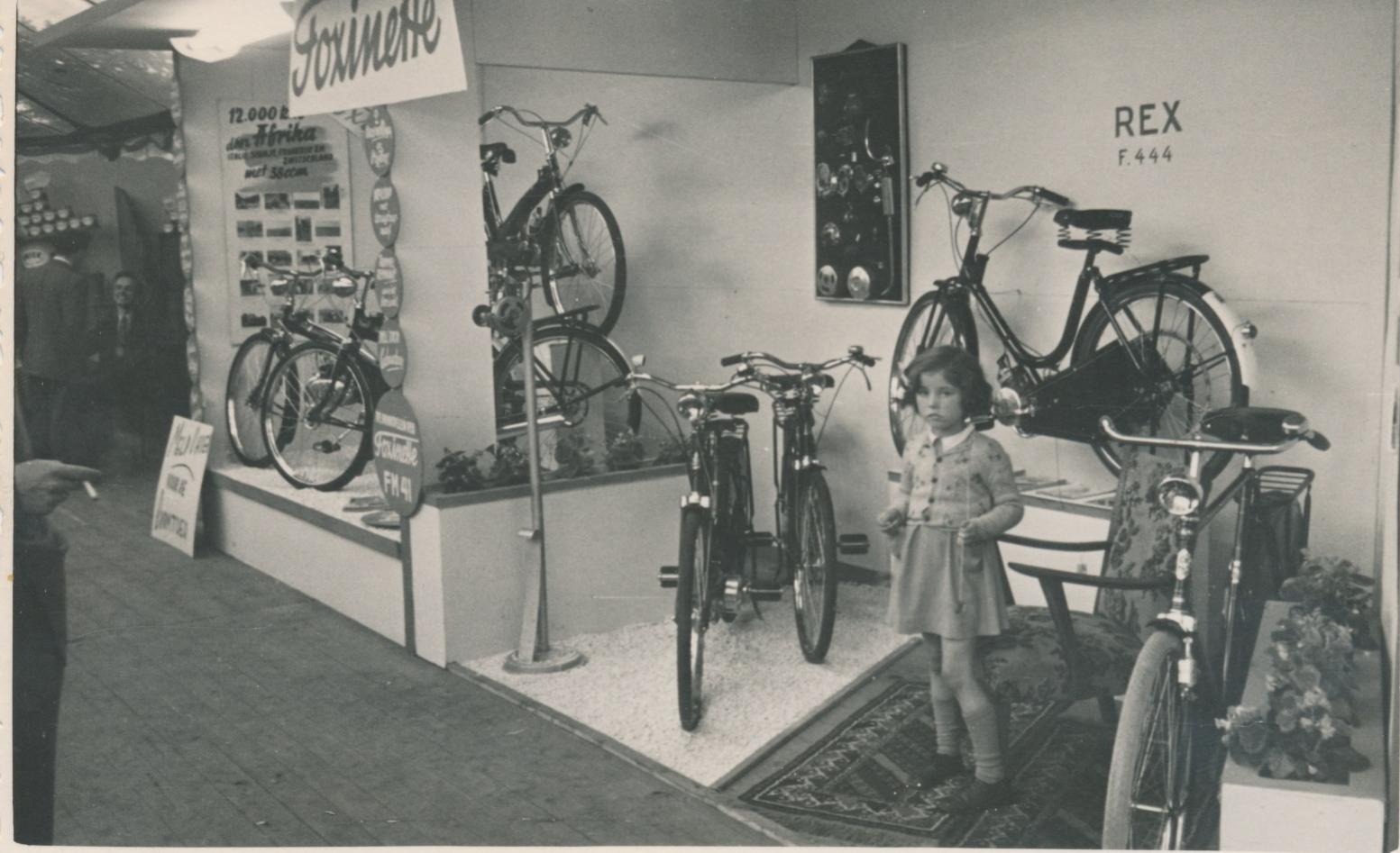 Natuurlijk is dit een beurs(je). De Foxinette werd gemaakt in 1952 en 1953. Dan moet die beurs ook toen zijn geweest. Maar het hoeft niet een specifieke rijwielbeurs te zijn geweest. De inrichting komt, ook voor 1953, wat amateuristisch en geïmproviseerd over met die van huis meegenomen Pastoe-stoel en dat vloerkleedje. Ik geloof dat we dan ook niet in de Oude RAI (A’dam, Ferdinand Bolstraat) of in de Jaarbeurs Utrecht (de gloednieuwe Bernhardhal van 1953?) moeten zoeken, maar veeleer een kleinere en algemenere regionale beurs of tentoonstelling.