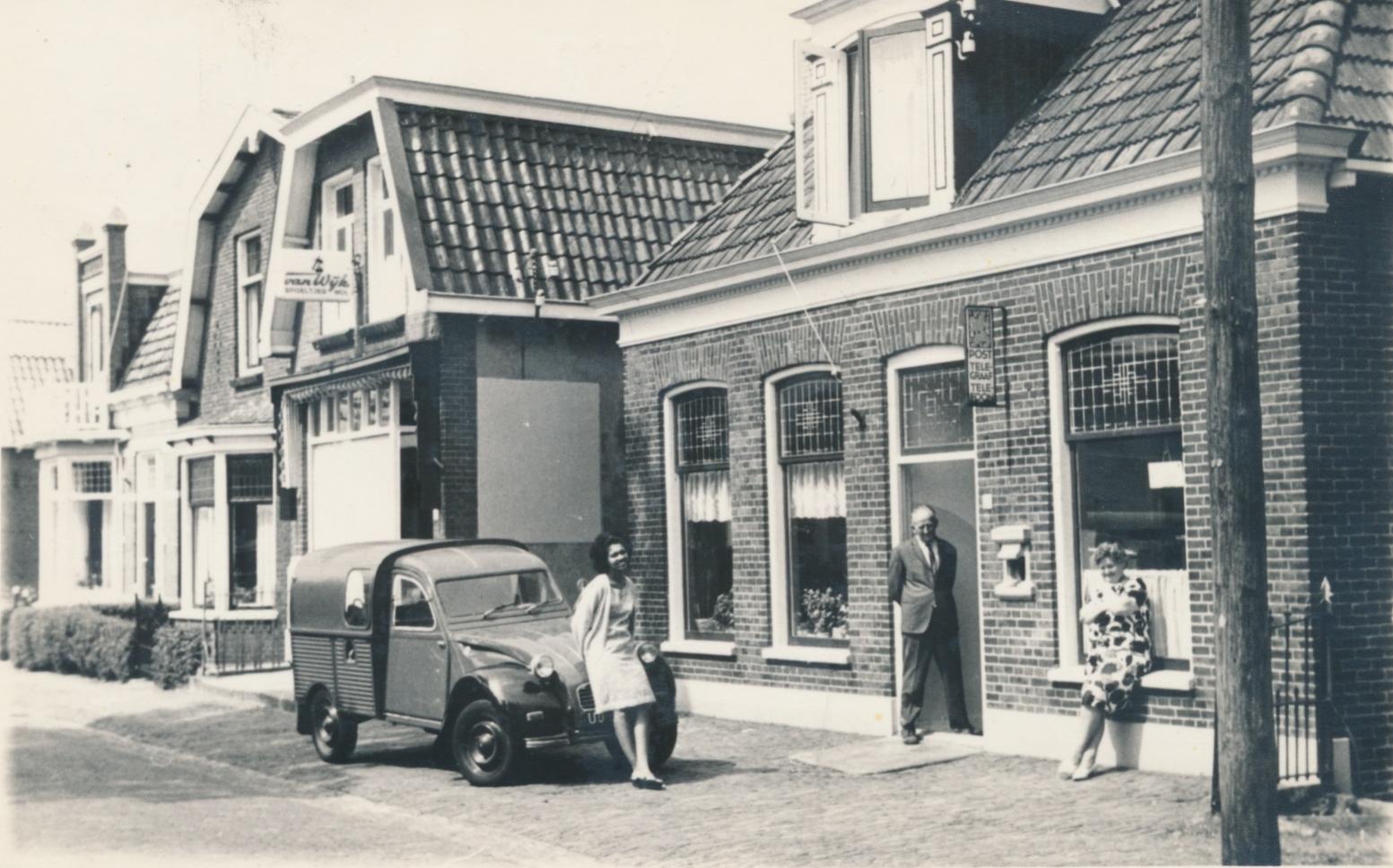 de heer De Haan zou in de deuropening staan en mevrouw Meintje (zij is de nicht van de mevrouw op de lelijke eend) in het raam