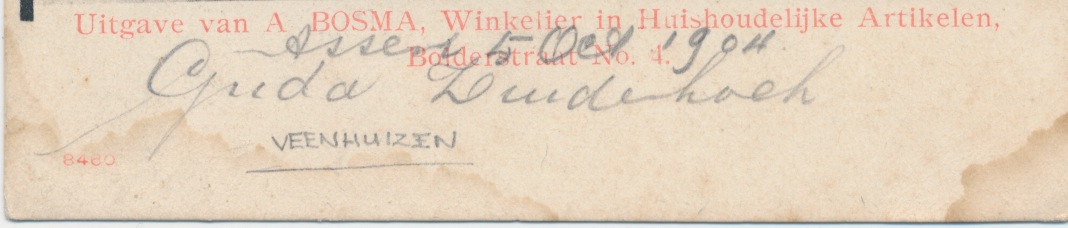op het uithangbord: Magazijn glas porselein aardewerk galanterieën (wellicht de winkel van de uitgever van de kaart)