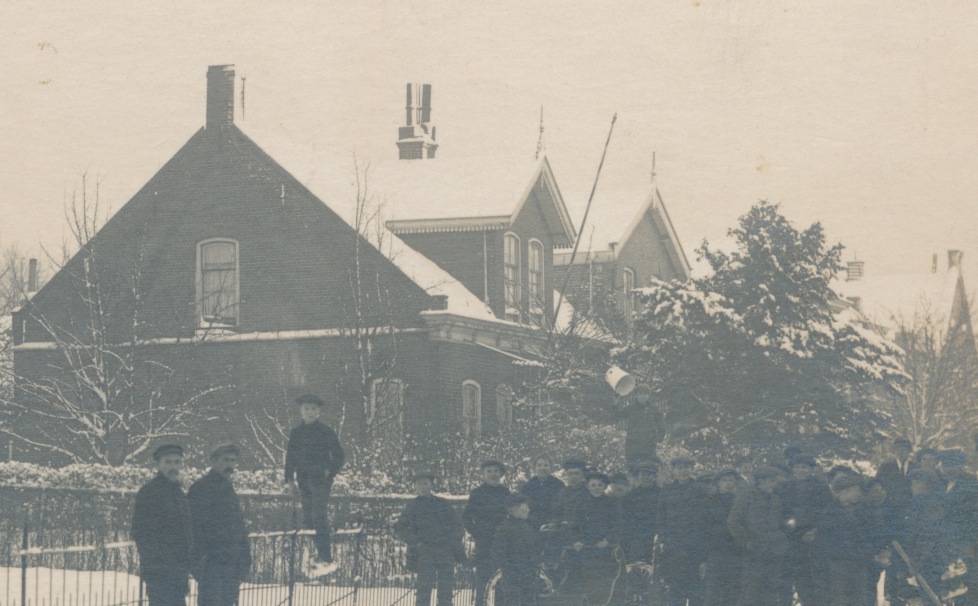 3656g mensen naast hek bij lantaarnpaal in sneeuw HJR