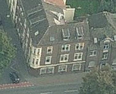 Te zien is een afgeschuinde hoek, die vanaf de eerste verdieping een uitbouw heeft (wit op de schermafbeelding die ik van Bing heb gemaakt). De kant van de Hansaring is dan rechts (tegenwoordig is dat de Südring, de Hansaring loopt vanaf dit kruispunt naar links, maar het lijkt mij vrij waarschijnlijk dat het stukje rechts vroeger ook Hansaring heette). Daar zien we op de begane grond een vrij breed raam, met daarboven een smal raam. Rechts daarvan op de begane grond een wat smaller (maar nog steeds breed) raam, met erboven een raam over dezelfde breedte, dat echter duidelijk is verdeeld door een verticale stijl. Dit alles meen ik ook te zien op dit zoekplaatje.