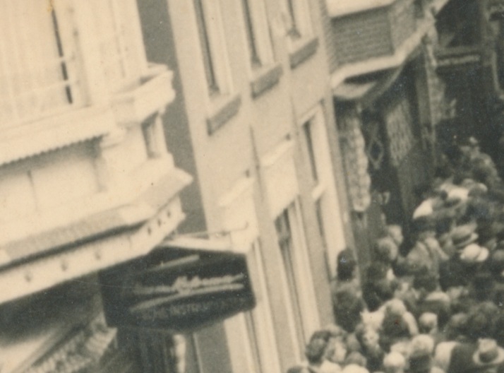 nu ik deze kaart nog eens goed bekijk, zie ik op een uithangbord staan: ...(electri?)sche instrumenten en als ik het goed lees, begint de achternaam met een K. Iets verderop is een deel van een huisnummer te zien en ik denk dat er 47 staat. De ramen zijn aldaar met plakband afgeplakt om de gevolgen van rondslingerend glas tegen te gaan bij een mogelijke bomaanval. Ik zie geen mensen met pannetjes, dus er is geen sprake van voedseldistributie in de vorm van maaltijden.