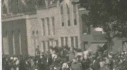 Mogelijk staat R.W.B. voor Rood-Wit-Blauw, een voetbalclub die begon in Besoijen en daarna onder Waalwijk viel. De geschiedschrijver is wat vaag over jeugdleden, maar na de oorlog zijn die er in grote hoeveelheden. De foto lijkt mij, aan de damesmode te zien, van rond 1950 of iets later. Zien we hier de bebouwing van Waalwijk, met rechts de ingang van een kerk? http://www.rwbwaalwijk.nl/index.php.