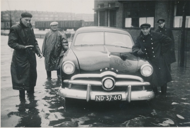 de mannen rond de auto t.t.v. hoogwater ,staan volgens mij op de hoek Keileweg/Viethavenstraat Rotterdam west.(inverpak)