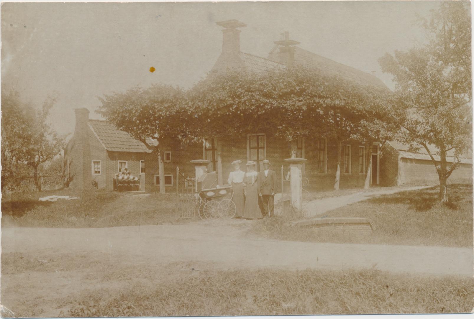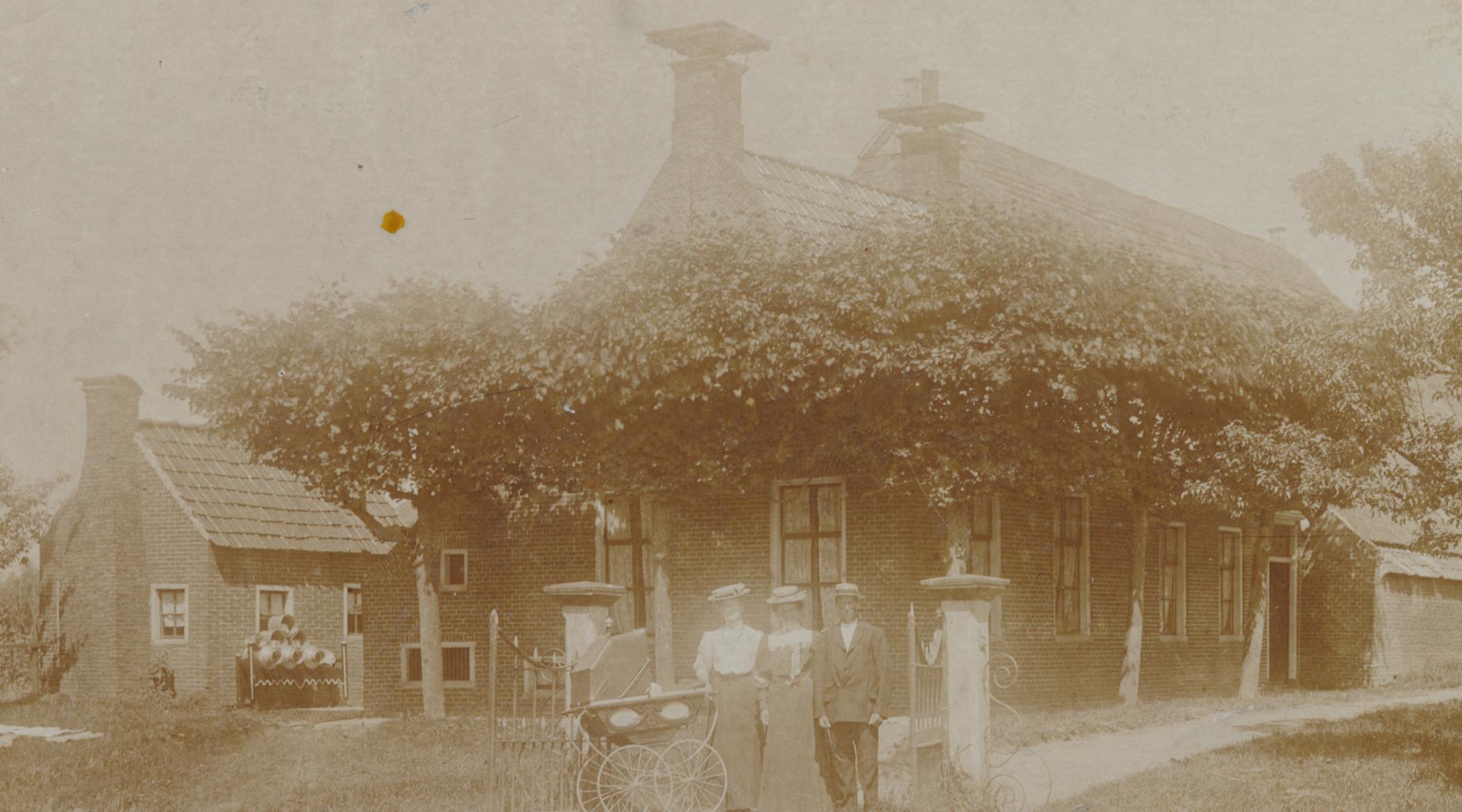 trotse familie met kinderwagen voor boerderij met schoorsteenplaten