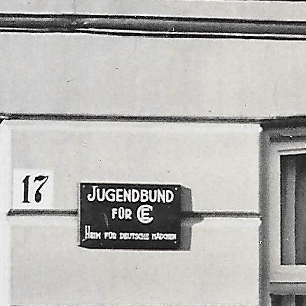 Echter bordje op deur "Heim fur Deutsche Mädchen". Mogelijk WOII?? Huisnr 17