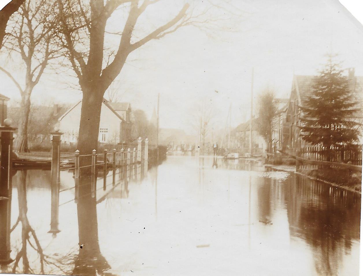Dit is de Dorpsstraat in Wichmond, naar het noorden gezien. Foto dateert uit 1920 toen de Baakse Beek overstroomde. Links zien we nog net een stukje van de NH pastorie. Het hek staat er nog, maar de bollen zijn verdwenen.