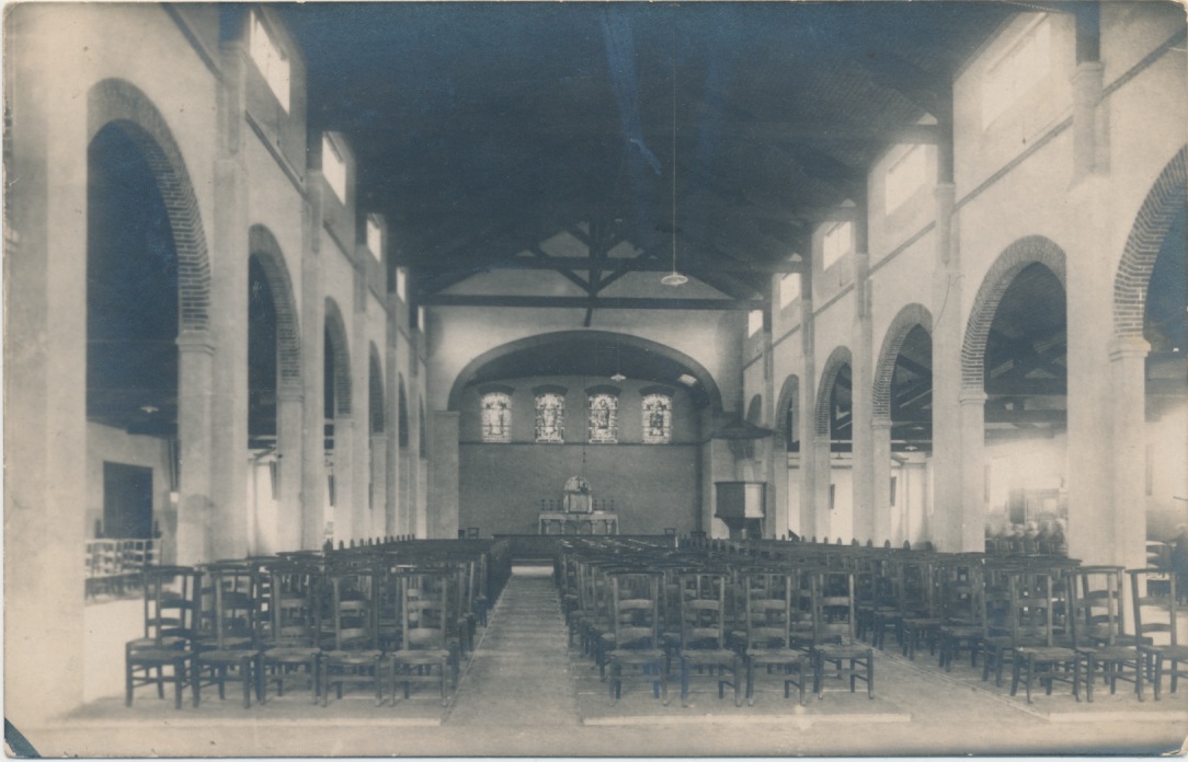 kerk staat vol stoelen, gericht op de plek van de fotograaf