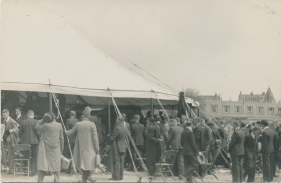 Dit is een of andere tentbijeenkomst (maar vraag me niet welke...) op het Catsplein in Leeuwarden, met in de verte de bebouwing van de Elizabethstraat. Ik schat de kaart eind jaren 40, begin jaren 50.