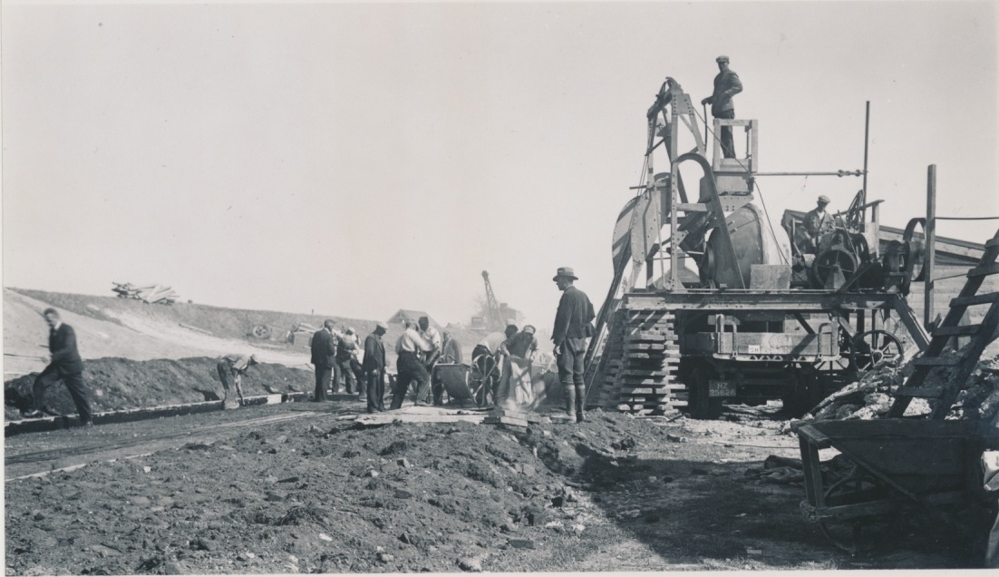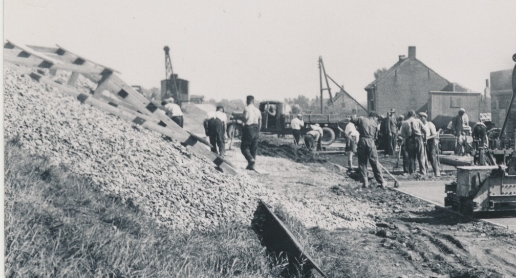 links naast de keet met: Hollandsche Beton Mij. Den Haag Asfaltwegen is op de machine te lezen: