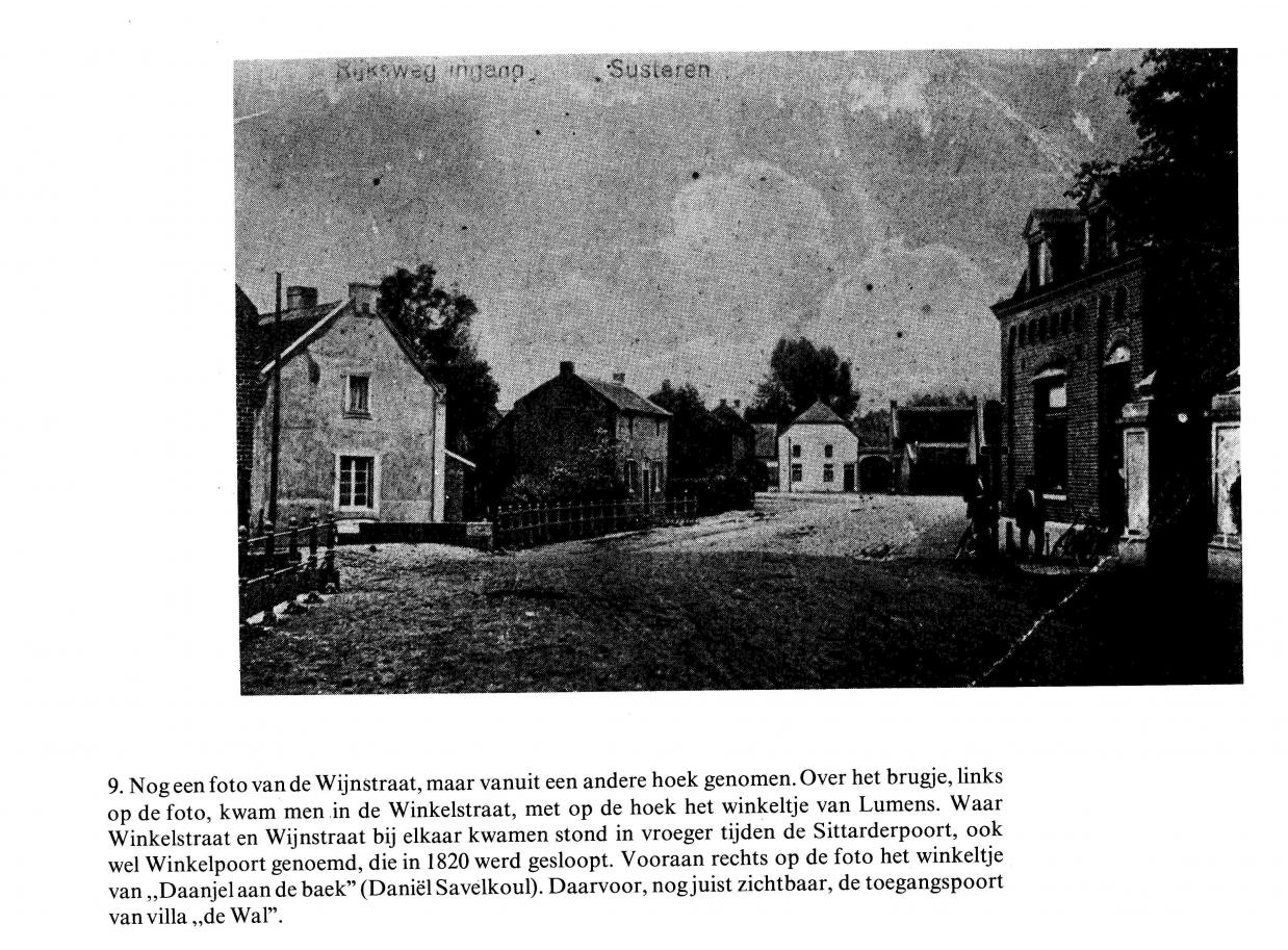 Zoekplaatje en bewijsfoto (Susteren in oude ansichten, dl. 1 en 2) zijn moeilijk met elkaar in overeenstemming te brengen, maar de pilaren van de ingangspoort rechts geven houvast. Zij vormden de toegang tot de villa De Wal, een mooi herenhuis dat na zware oorlogsschade in 1945 werd gesloopt.