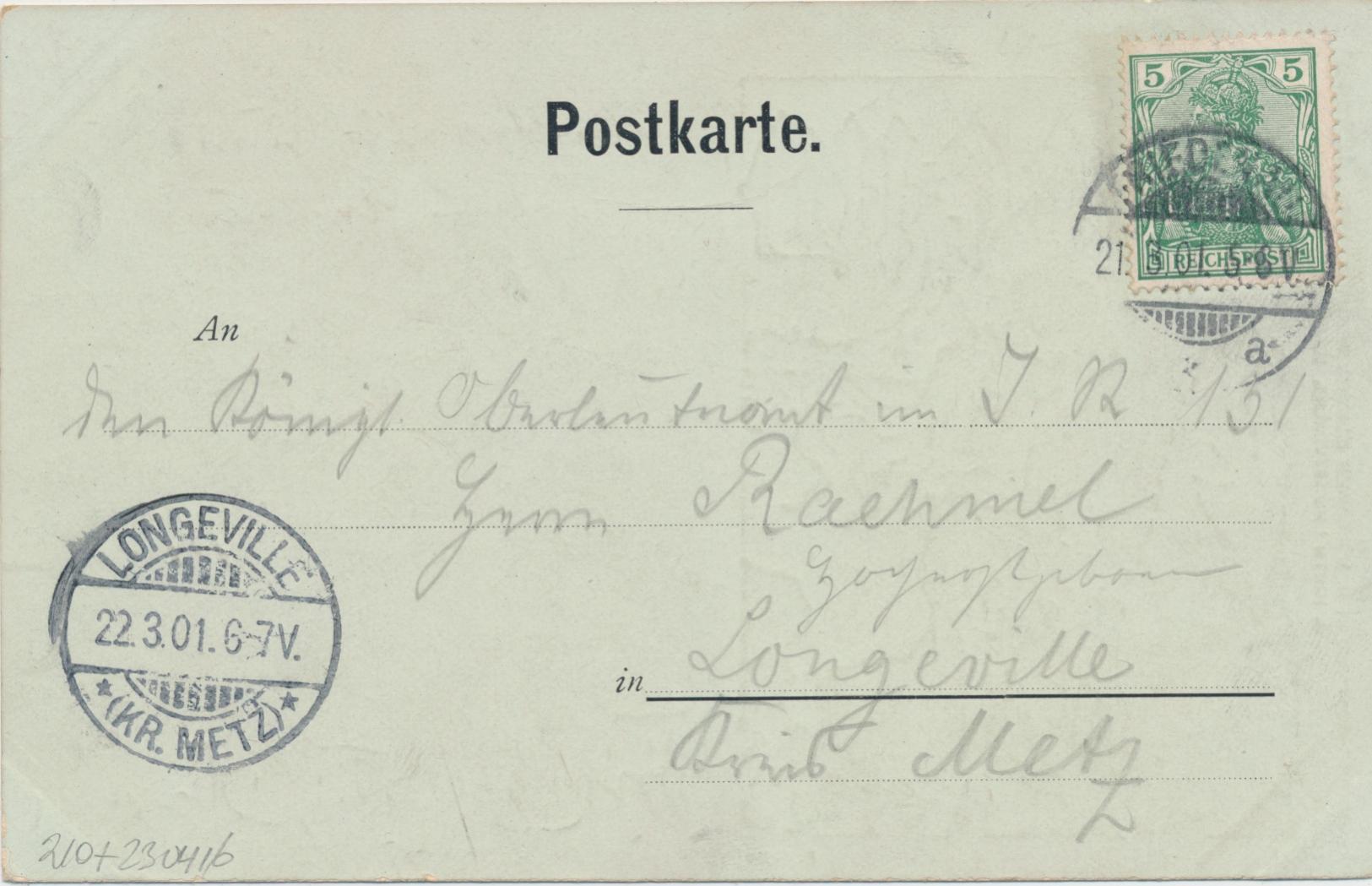 De tekst in potlood is niet zo interessant (een verlate verjaardagsgroet aan een Oberleutnant in Lotharingen). De afbeelding is de voorplaat van nr. 18 van de eerste jaargang (1896): http://digi.ub.uni-heidelberg.de/diglit ... c2bde294f3