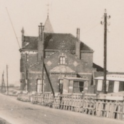 Dit is de noordelijke op/afrit van de Barendrechtse brug. Het huis met torentje is het tramstation van de RTM stoomtram. De fabriek is de VELO-wasmachinefabriek aan de Achterzijdijk in de gemeente Barendrecht.