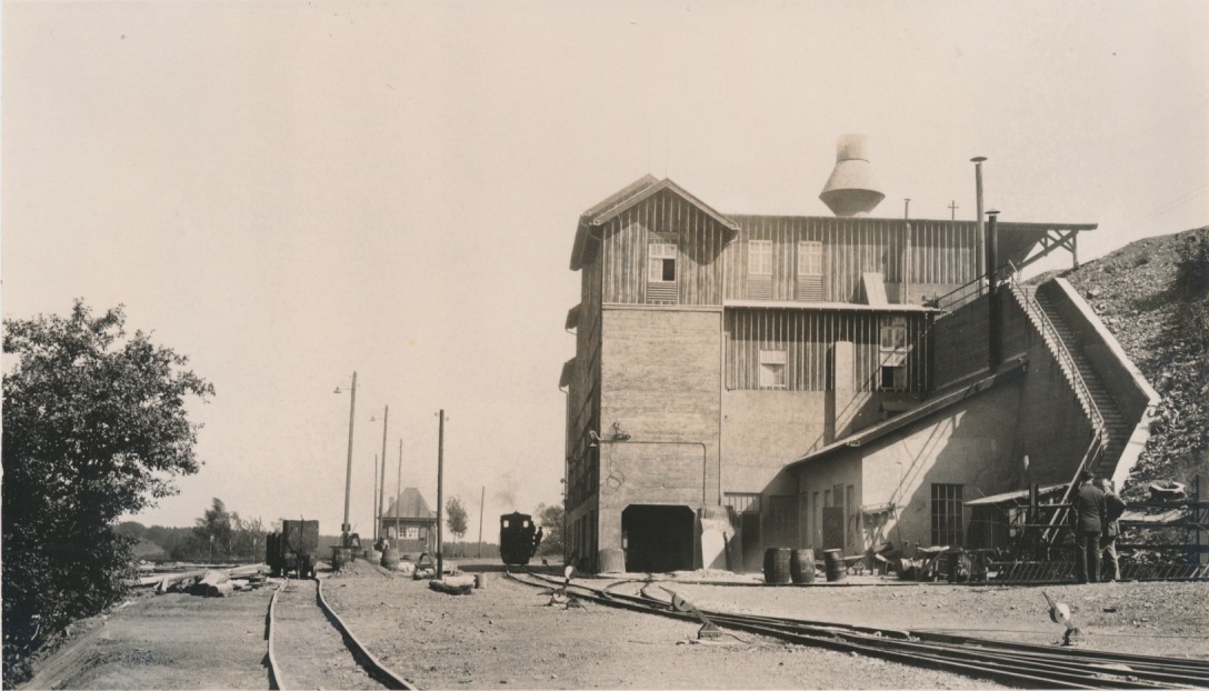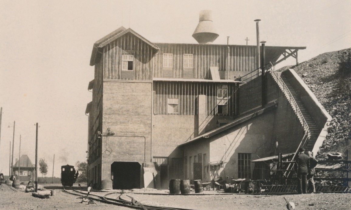 betonnen onderkant van gebouw met houten opbouw, afgeknotte schoorsteen, rechts betonnen trap