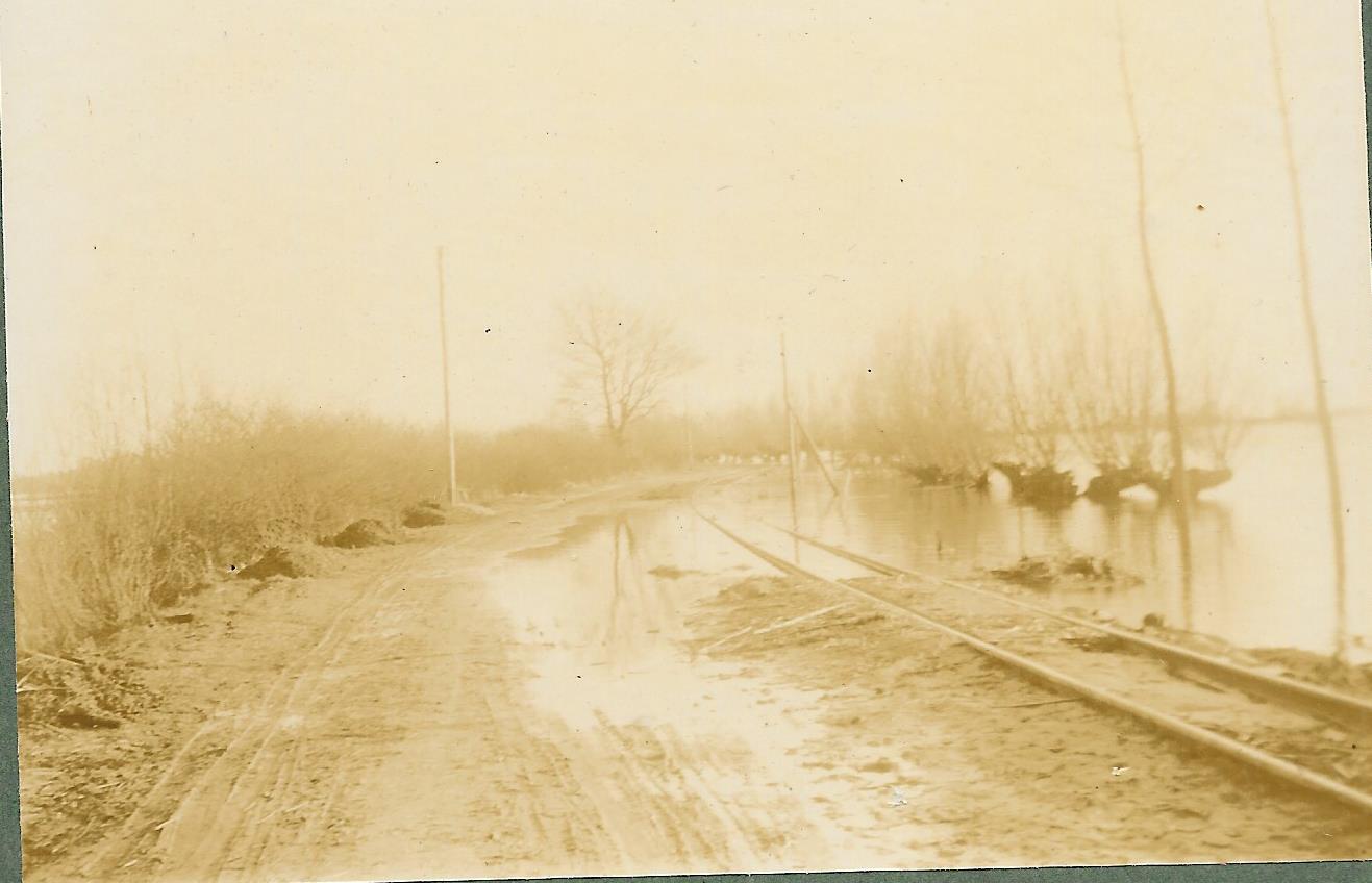 De knotwilgen staan tot hun kruin in het water, dus rechts van de weg moet het water diep zijn. We hebben hier kennelijk te maken met een weg op een dijk, die zowel links als rechts in het water staat. Op de dijk ook een tramspoor?
