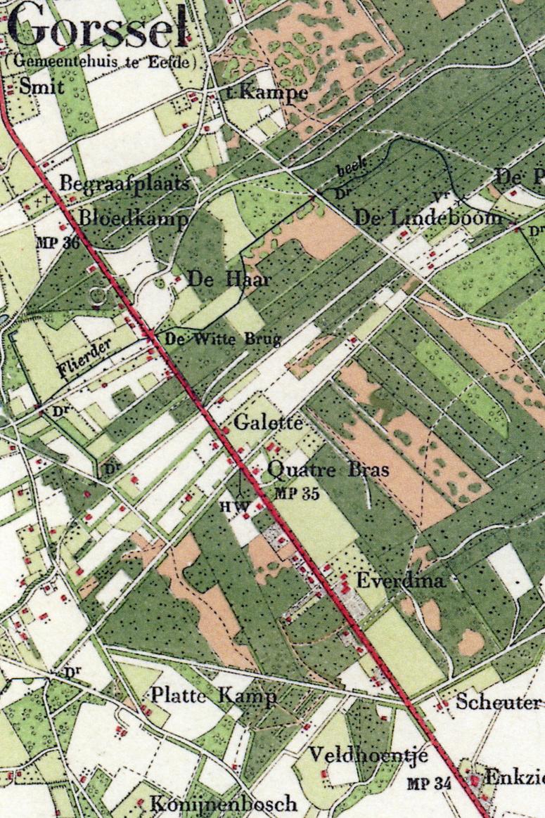 Begraafplaats (achter de boerderij), De Bloedkamp en De Haar. Ter hoogte van De Haar ligt de brug waar het hier om gaat, nl. de Witte Brug.