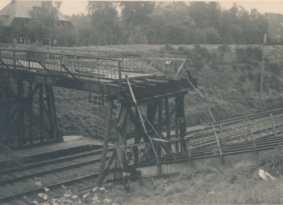 4813 ingestorte ijzeren brug met tekst in talud