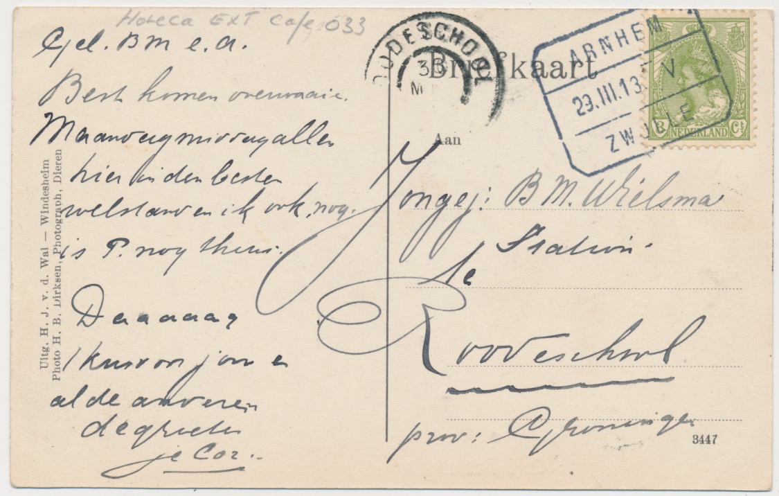 belijnde gelopen pbk, gestempeld Arnhem - Zwolle maart 1913