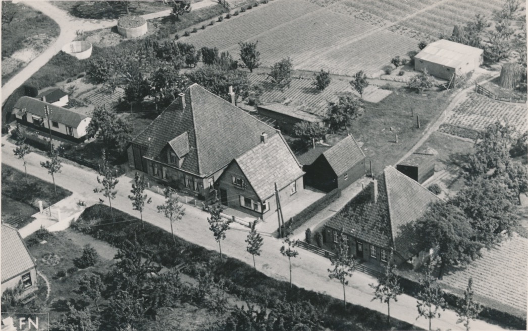 5111 luchtfoto van twee stolpboerderijen (met puntdak)