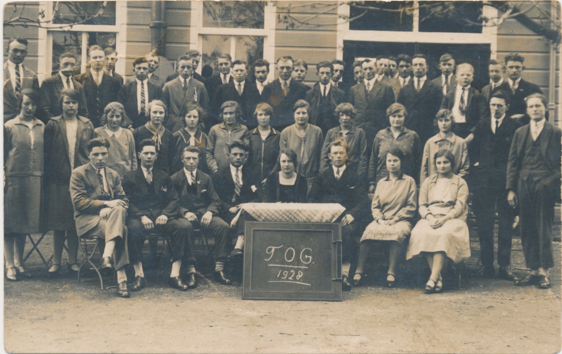 heeft het bestuur plaatsgenomen achter de tafel, met ervoor een bord waarop T.O.G. 1928