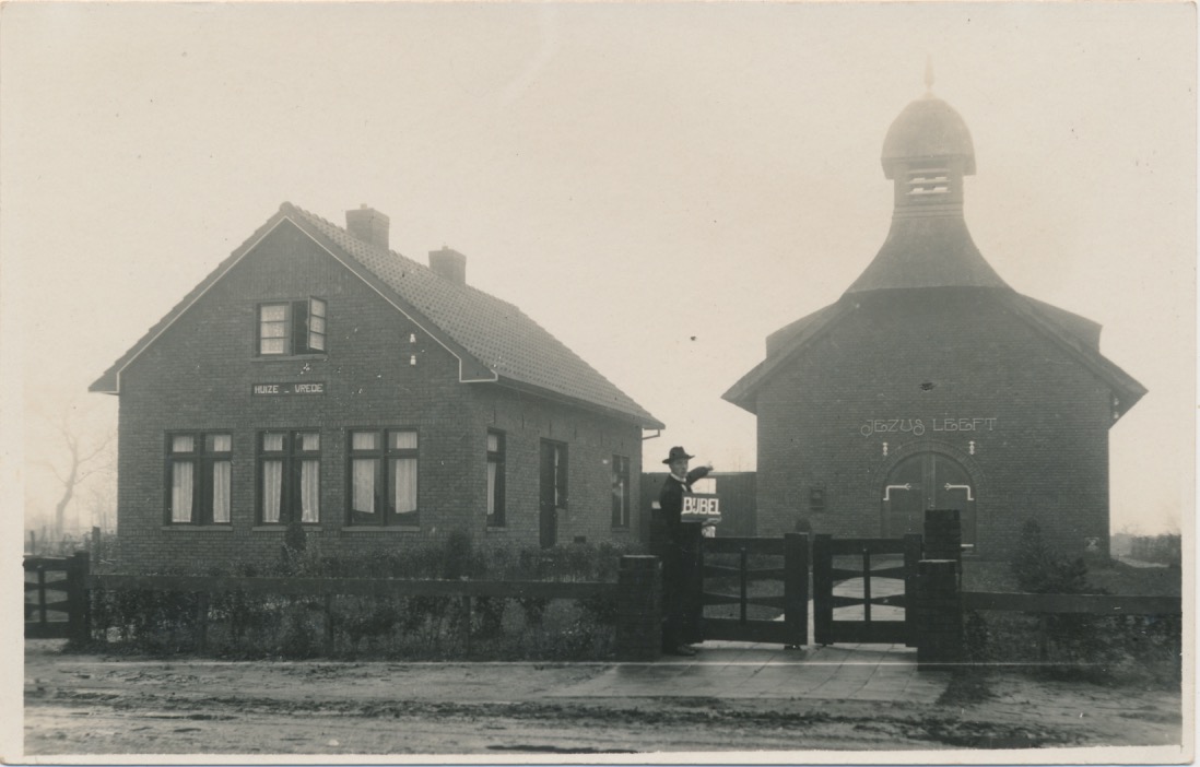 5148 kerk 'Jezus leeft' en pastorie 'Huize-Vrede' en dominee met bord: Bijbel