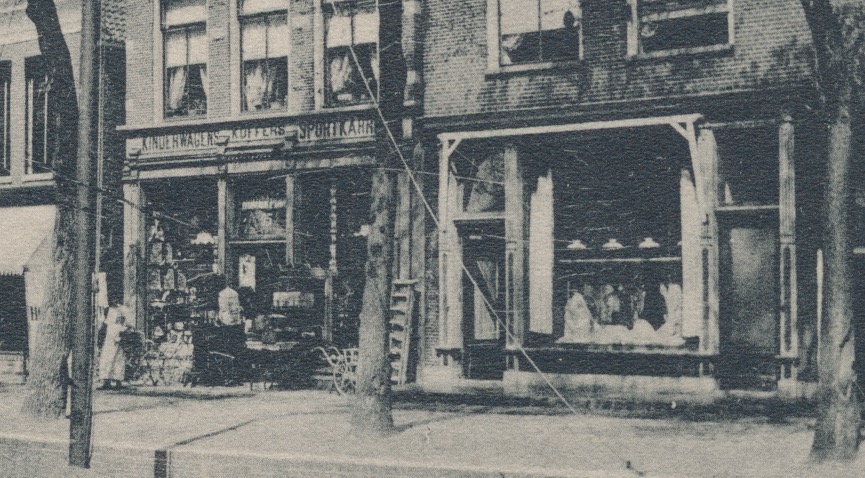 de middelste winkel heeft boven de etalage de tekst: kinderwagens, koffers, sportkarren