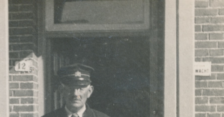 de man in uniform heeft een pet op met een wapentje, op zijn revers een insigne / onderscheiding