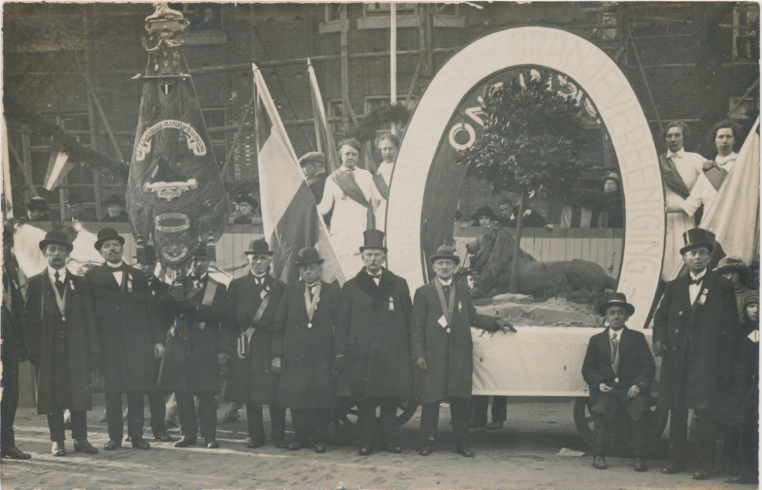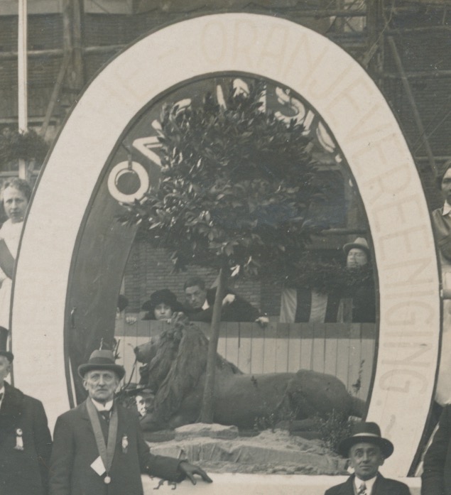 In het Rotterdamsch Nieuwsblad van 30 september 1925 staat ter gelegenheid van het 6o-jarig bestaan (oprichtingsdatum is 1865) een ruim overzicht van de gebeurtenissen tot dan toe. In 1922 werd de inneming van Den Briel herdacht met medewerking van de Rotterdamse Bond van Oranjeverenigingen werd een optocht gehouden en op de Nieuwe Markt kransen gelegd. De Nederlandsche Oranjevereeniging nam aan de optocht deel met een praalwagen waarop het insigne van de vereniging werd voorgesteld. Op het insigne en ook op het vaandel is een liggende leeuw zichtbaar. Een andere mogelijkheid is de optocht ter gelegenheid van het 60-jarig bestaan in 1925. In het artikel worden alle deelnemers genoemd uiteraard ook de Oranjevereeniging zelf met een praalwagen en met het insigne. Helaas staat er geen omschrijving van de praalwagen bij genoemd. De route staat uitgebreid beschreven met alle straten die gepasseerd zullen worden. Start en finish van het terrein van de Heineken Brouwerij.
