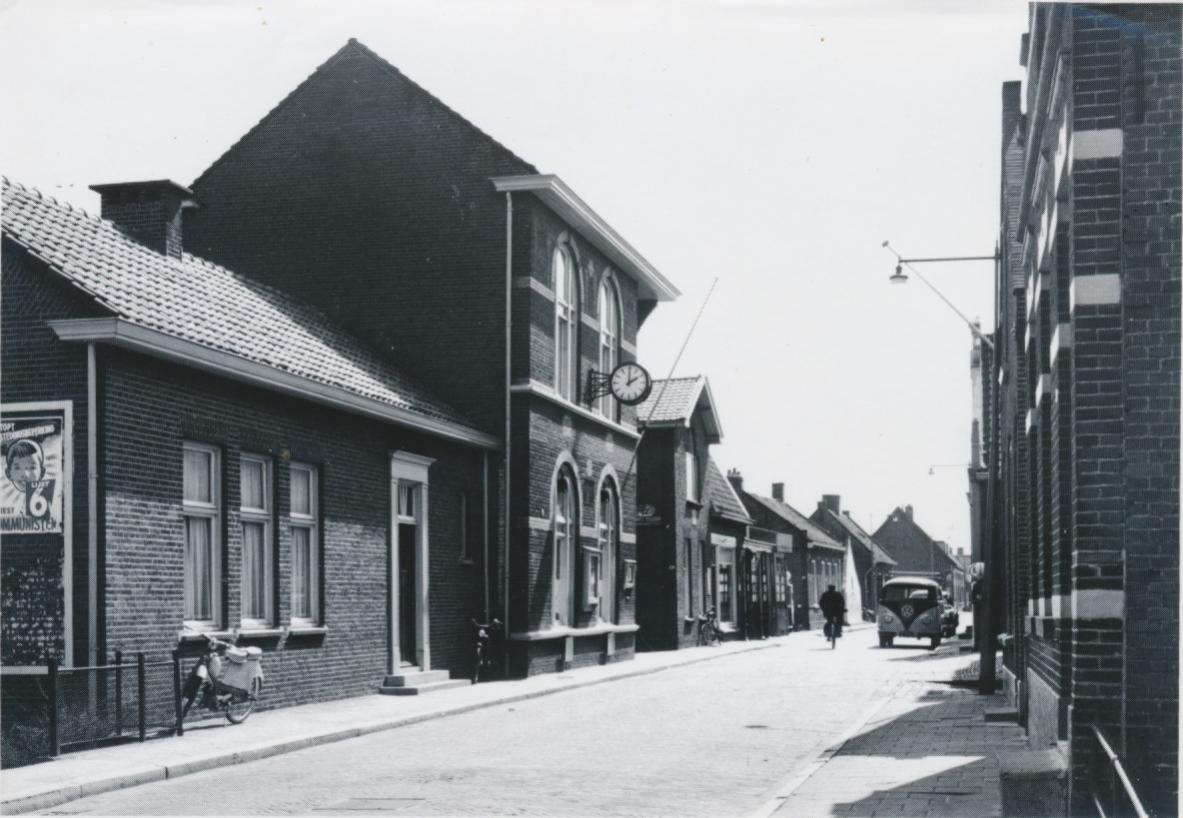 het pand links komt op mij over als een gemeentehuis met de publicatiekastjes aan de gevel met de boogramen